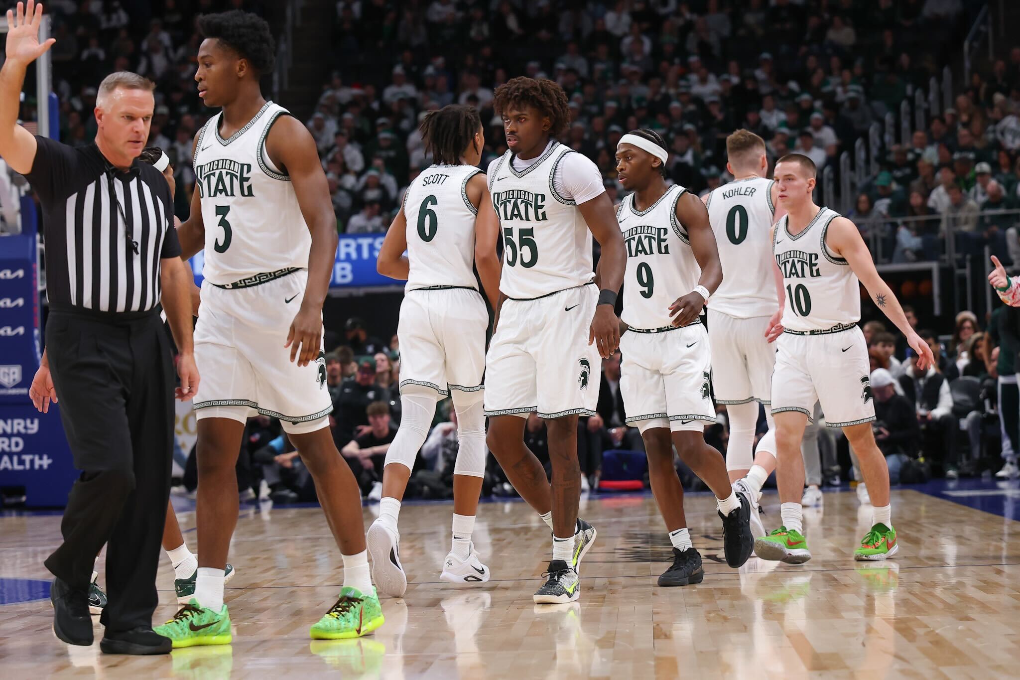 At the half, the Spartans had nine points from Kohler, eight from Carr, and seven from Cooper. Michigan State dominated the boards in the first half, 25-13, including scoring 10 points off nine offensive rebounds.
