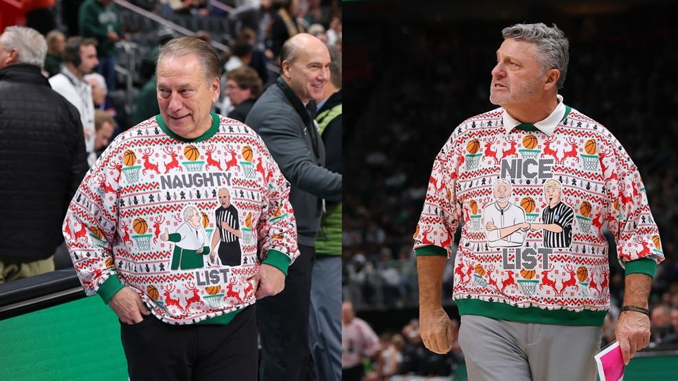 Perhaps the most anticipated question on the minds of college basketball fans leading up to the annual matchup between the Spartans and Grizzlies was the design of the ugly Christmas sweaters worn by Coach Tom Izzo and Coach Greg Kampe.