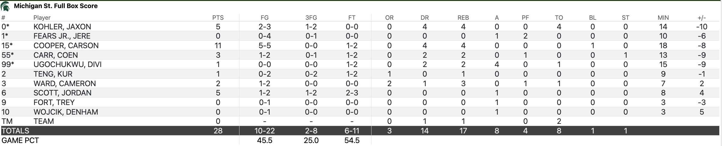 Carson Cooper led the team in scoring with 18 points, falling just short of a double-double with nine boards and a block. Jaxon Kohler and Jeremy Fears Jr. both added 15 apiece for Spartans in double figures. Fears added five assists and Kohler eight rebounds.