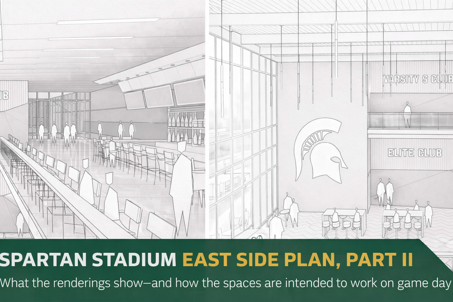 Editor’s note: This piece is best read in conjunction with our earlier report, Inside Michigan State’s plan to rebuild Spartan Stadium’s east side, which outlines the project’s origins, timeline, funding framework, and broader strategic goals. That article provides the narrative and institutional context for what follows. The material below builds on that foundation, focusing more narrowly on the design concepts, spatial organization, and how to properly interpret the preliminary images and diagrams that have been released to date.