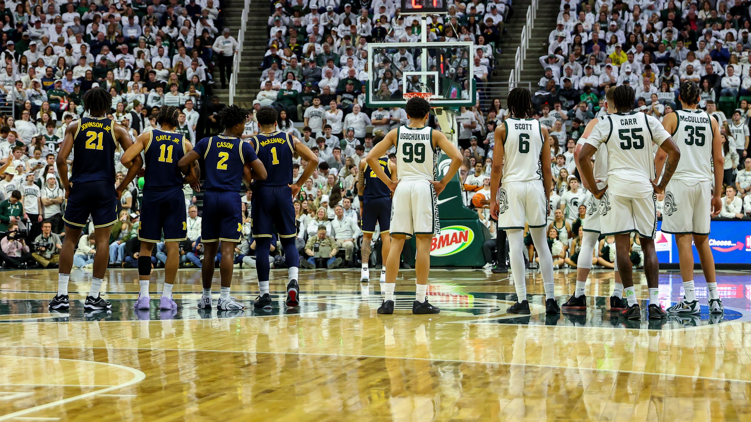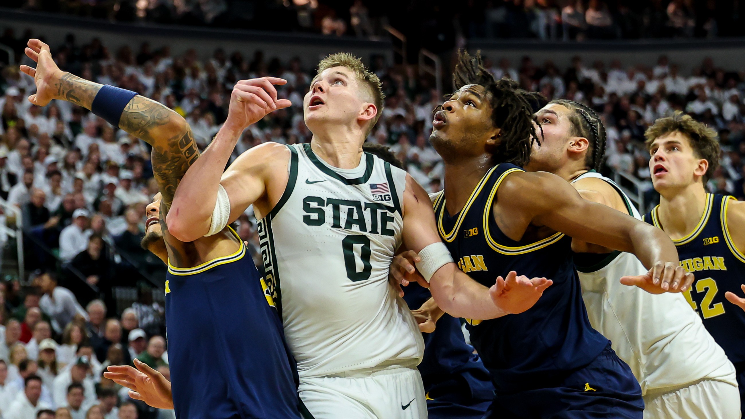 Even with the rocky start, the Spartans trailed by only eight points with 2:29 remaining in the first half. A foul was initially called on Wolverine star Yaxel Lendeborg as he jockeyed with Cam Ward for a rebound, but the officials initiated a video review.